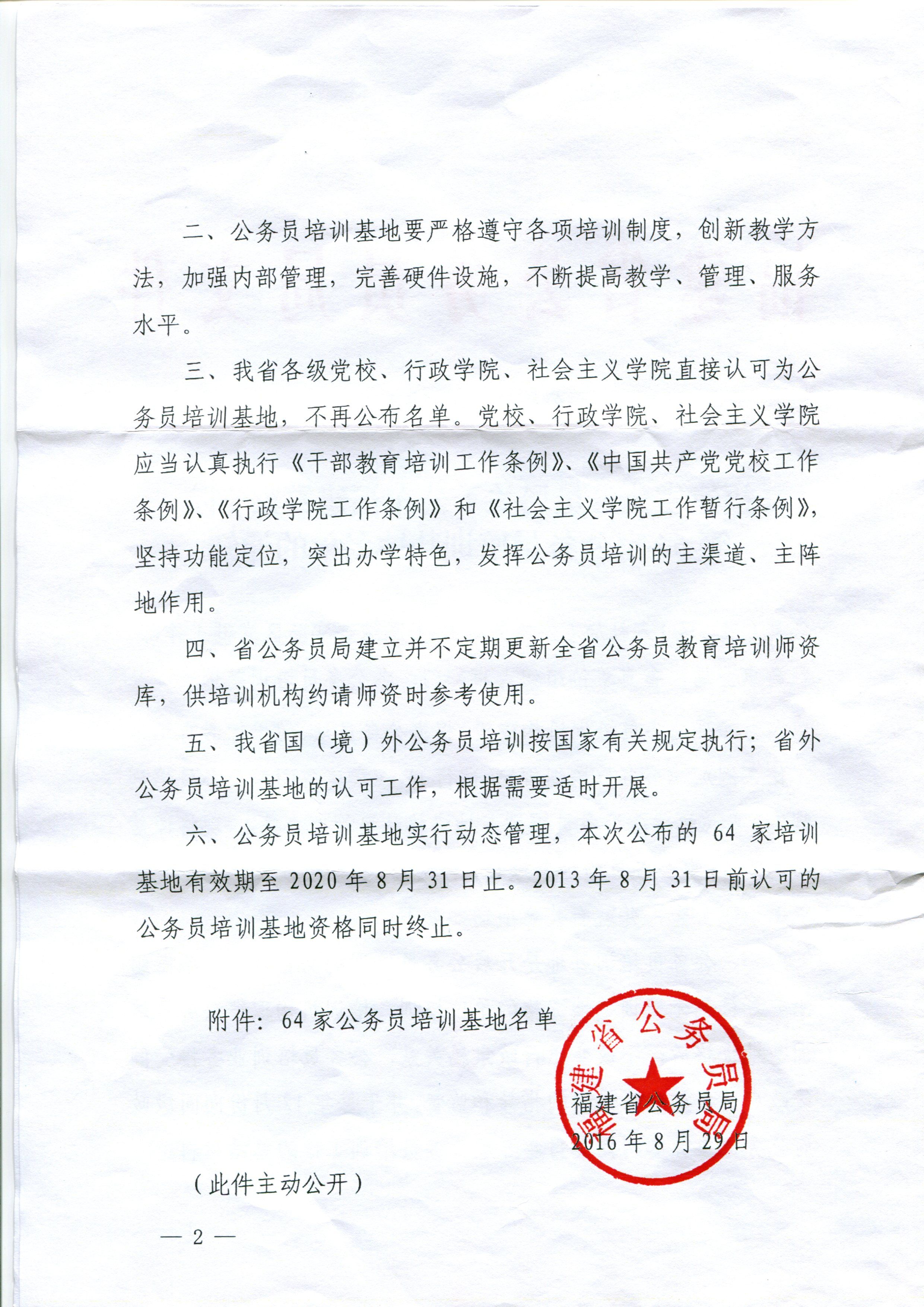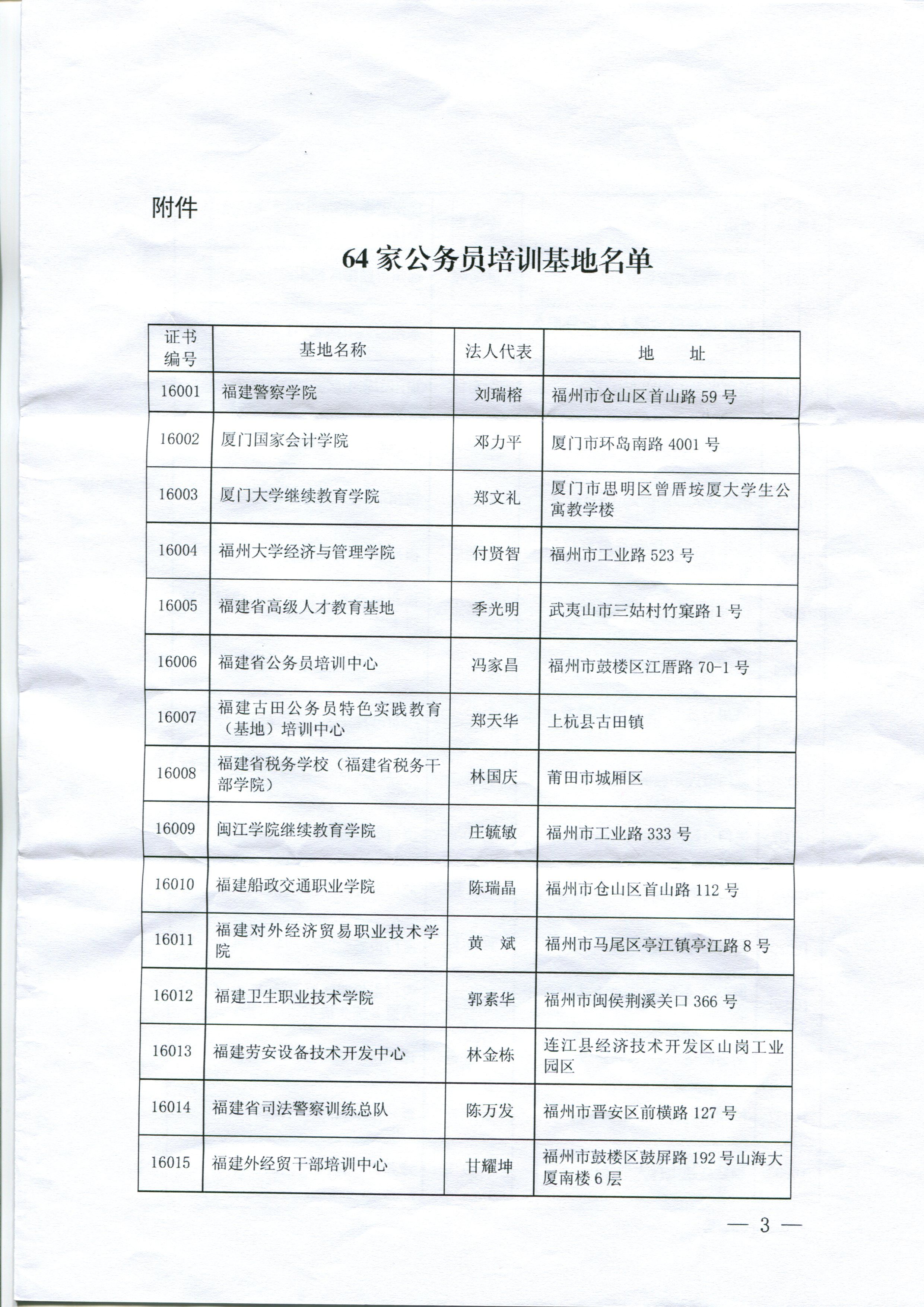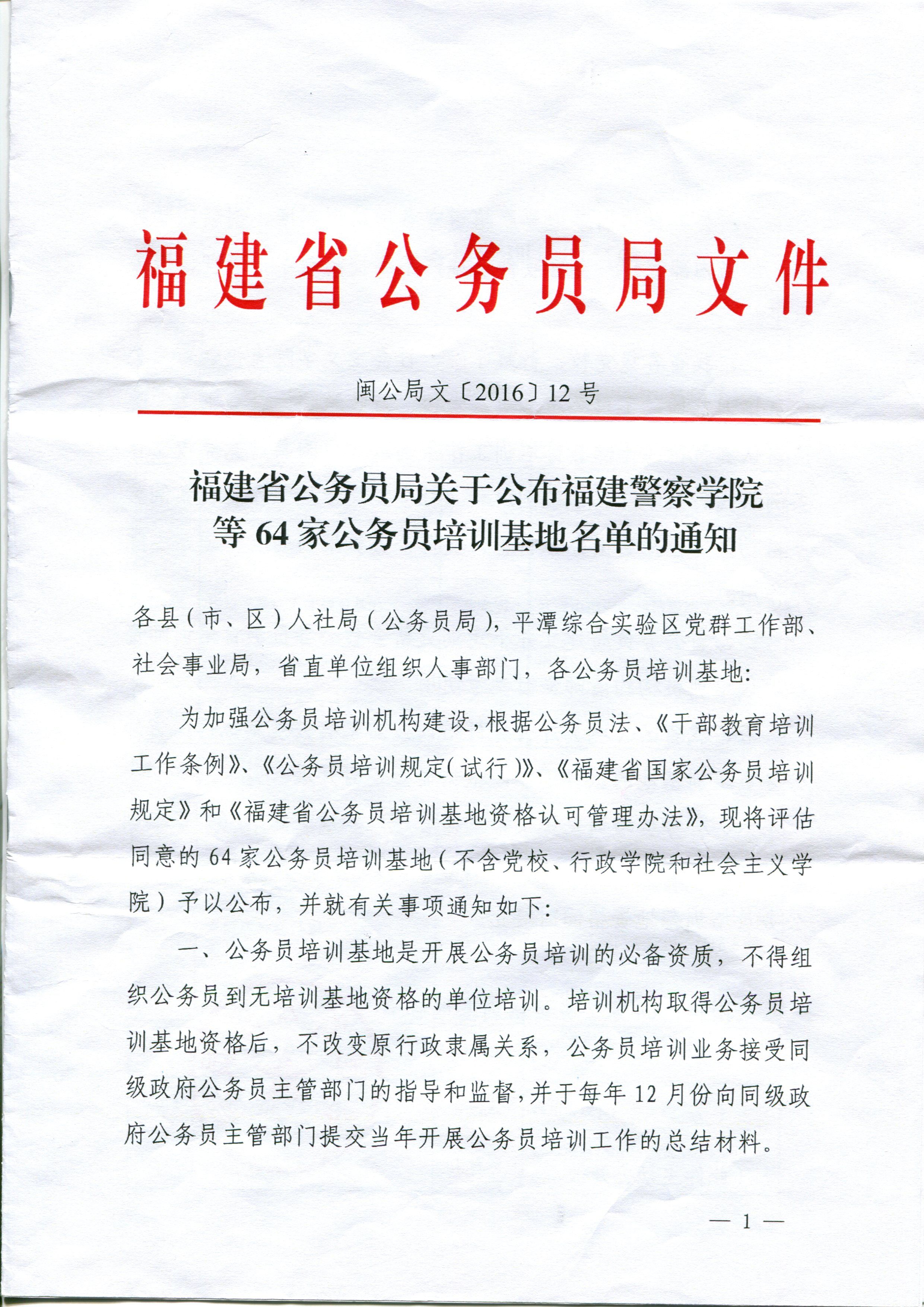 厦门市金海峡高级人才培训中心自2016年8月29日经《福建省公务员局关于公布福建警察学院等64家公务员培训基地名单的通知》(闽公局文[2016]12号)文件批复,获得福建省公务员培训基地资格,开展全省公务员培训工作。至今,为全省二十余个公务员单位累计培训公务员6747人。其中省直单位系统十余个,培训内容涵盖党建、依法行政、业务培训、公务员职业道德建设等多个方面。
